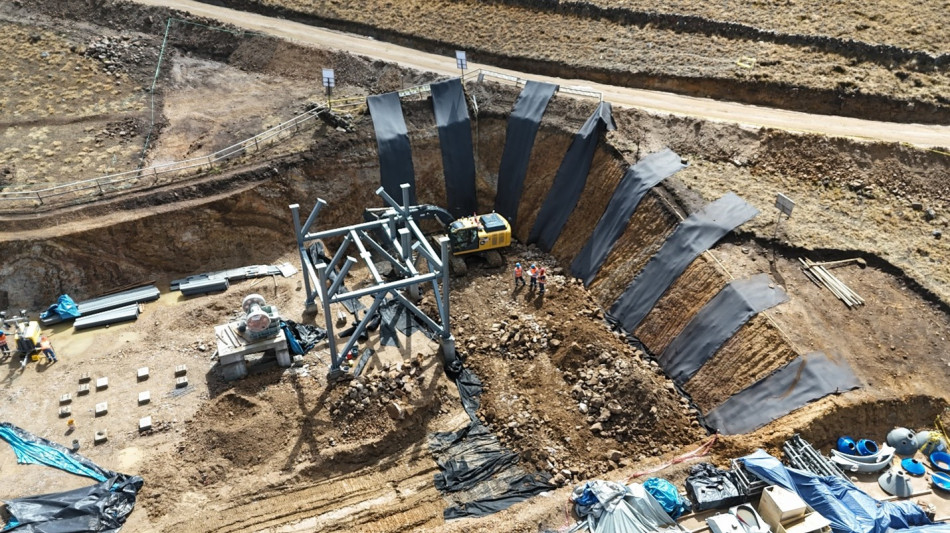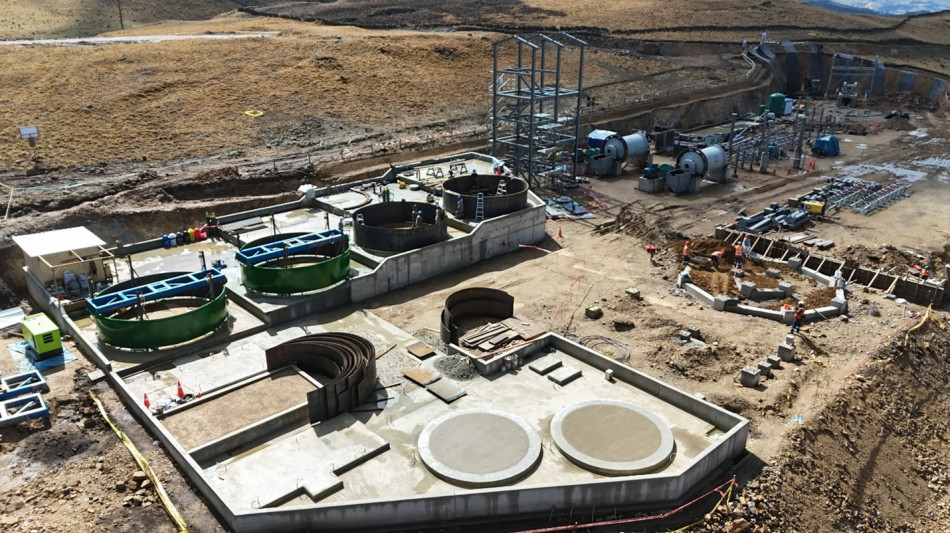 The EPC contractor continues with the last part of the civil works, with the construction of the retaining wall to allow trucks to tip ore into the coarse ore hopper and the circular pedestals for the water tanks and thickener, in addition to the bases of the desorption plant (rectangular), among others.