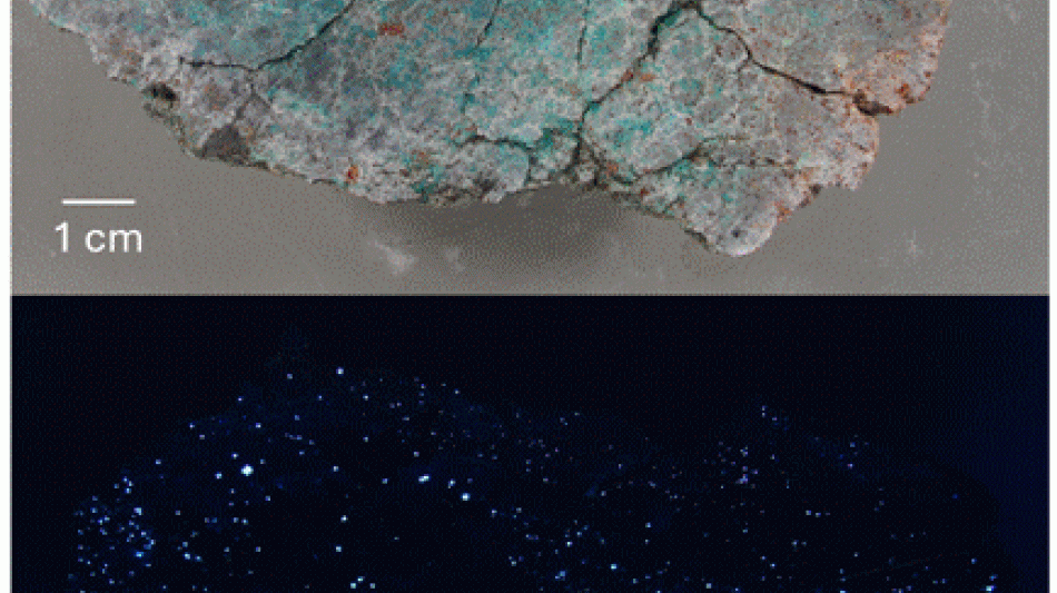 Figure 3.Visible light and ultraviolet (UV) light view of copper oxide and scheelite rich skarn from the Muller Mountain area.