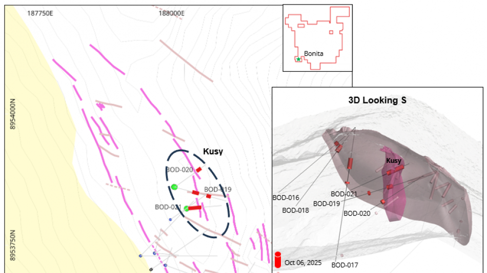 The Kusy discovery is the result of the first drilling on the eastern flank of the Bonita vein system exposure and consists of breccias and fine quartz vein fragments similar to the mineralization encountered in drilling on the western exposure