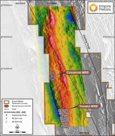 Figure 2: MRE outlines for Thomas and Cosgrove Deposits with background images of airborne gravity survey results with the location of the AC, RC and DD drillholes