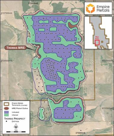 Figure 3. Thomas Deposit: Location with MRE outline and drill collars