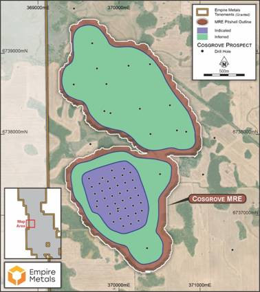 Figure 4. Cosgrove Deposit: Location with MRE outline and drill collars