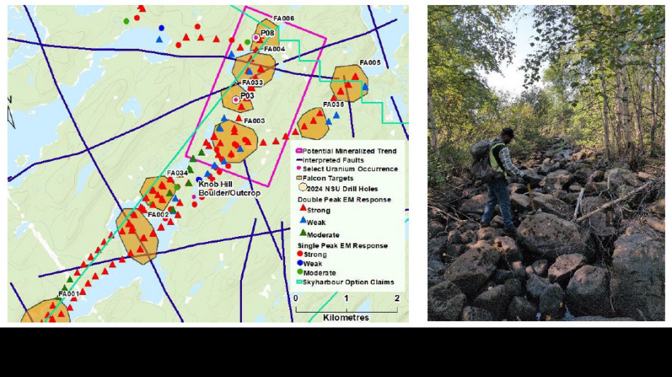 At target FA005, the conductor is intersected by an interpreted fault. Southwest of this, in an interpreted down-ice direction from the target, the prospecting team identified radioactive boulders within a boulder field. Metasedimentary and granitic boulders had radioactivity readings from 500-3,000 cps (Figure 2). At target FA033, where hole P03 was drilled by North Shore in 2024, a pegmatite boulder that was discovered registered 5,000-6,000 cps.