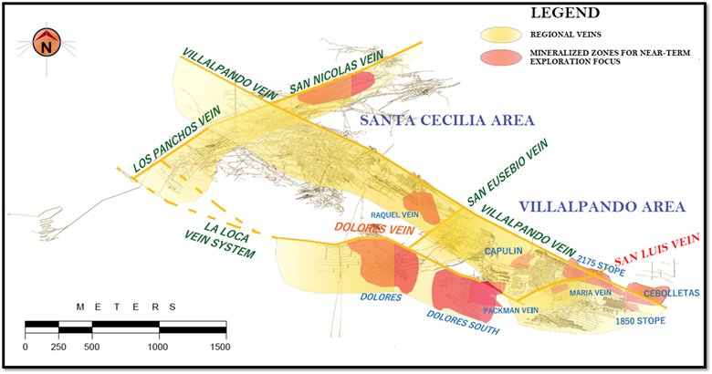 The northwest-southeast running Packman Vein, which is interpreted as a loop extending from the Dolores Vein, represents a potentially new mining zone. The Packman Vein is located near to the San Luis Vein, and is characterized as a narrow structure with high gold and silver content; the system rests in close proximity to the Company's property boundary with Fresnillo PLC, the world's largest silver producer. Notable intercepts include PAC25-01 which returned 1.8 g/t gold and 161 g/t silver over 1.05 metres and PAC25-03 which returned a bonanza grade of 26.7 g/t gold and 321 g/t silver over 0.42 metres.