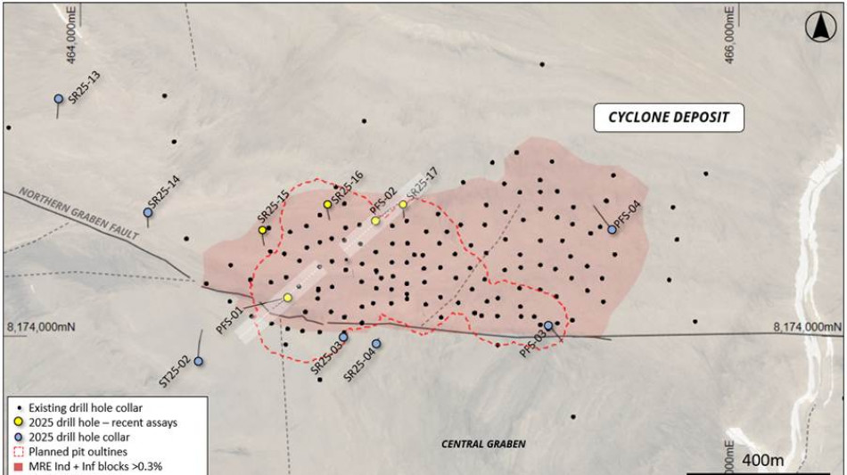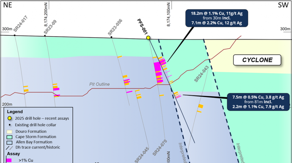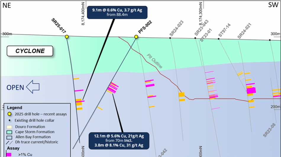 The copper mineralization in PFS-002 is located approximately 70m to the north of the current pit design. Follow-up drilling further to the north-east also intersected mineralization within the same horizon (9.1m @ 0.6% Cu, 3.7g/t Ag in SR25-017 - Figure 5). The mineralized horizon remains open to the north and along the entire northern margin of the deposit, highlighting the growth potential of the existing resource.
