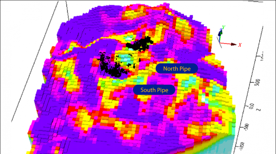Target 4 - South of South Pit:Target 4 is an elongate, northwest-trending anomaly (~400m by 300m) situated south of the South Pit. It exhibits a coincident gravity low and resistivity low signature that is strongest near surface but appears to dissipate around 200m depth. This shallower geophysical expression suggested Target 4 might represent a relatively shallow breccia pipe.