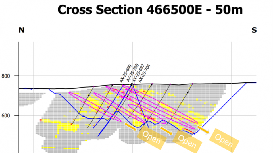 AX-25-697 - 2.69 g/t gold ("Au") over 11.8 metres ("m") within 0.65 g/t gold over 72.5m; including 29.3 g/t Au over 0.4m, 21.04 g/t Au over 0.4m, and 2.26 g/t Au over 3.4m.
