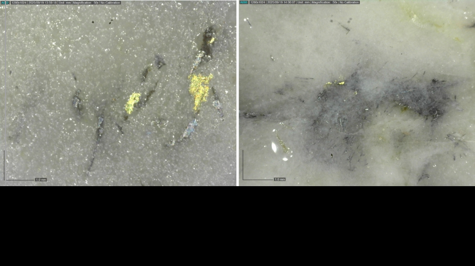 Figure 4: Visible gold associated with aggregates of acicular bismuth sulphosalts and fine-grained arsenopyrite. Intervals from drillhole AX-25-697 at 14.80-15.24m depth.