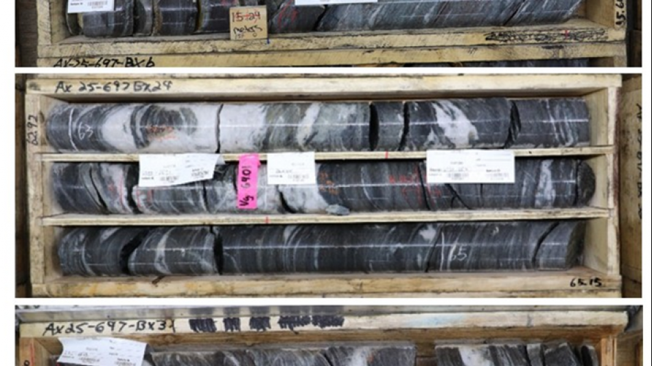 Figure 3: Zones of sheeted-veins in drillhole AX-25-697 in central Powerline.