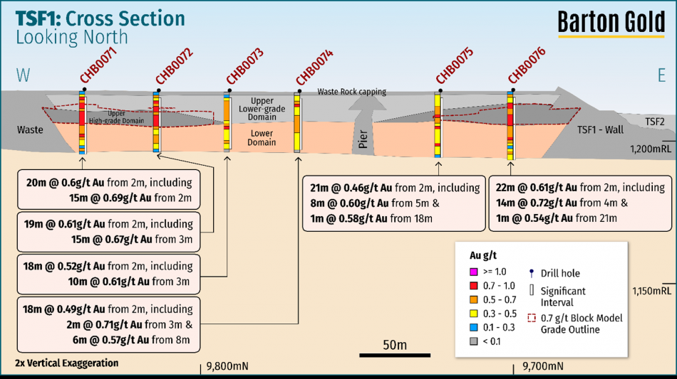 Figure 1 - Cross section showing higher-grade peripheral TSF1 materials & 0.7g/t Au grade shell1