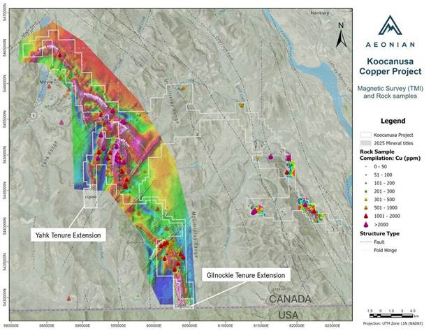 VANCOUVER, BC / ACCESS Newswire / October 27, 2025 / Aeonian Resources Ltd. (TSX.V:ALTN) (" Aeonian " or the " Company ") is pleased to announce the expansion of its 100%-owned Koocanusa Copper Project in southeastern British Columbia through the acquisition of two new contiguous mineral tenures. The additions build on results from Aeonian's recent airborne geophysical survey, which highlighted multiple high-priority magnetic anomalies along the 50 km copper corridor (see September 10, 2025 , news release). The expanded ground strengthens Aeonian's control of very prospective structural and stratigraphic traps within the Purcell Basin, the same geological belt that hosts Montana's world-class sediment-hosted copper-silver deposits.