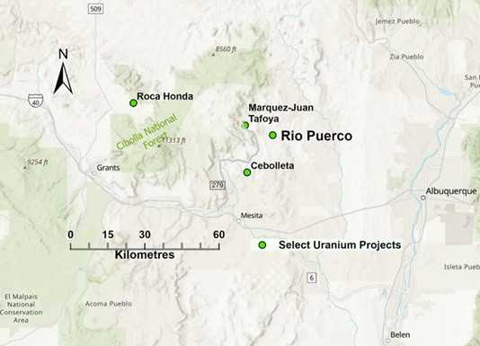 Rio Puerco is located at the eastern end of the Grants Uranium District which is the largest historic producer of uranium in the United States (Figure 3). Mines that operated between about 1950 and 2002 produced over 340 million pounds of U3O8. The district is currently seeing renewed exploration and development activity.