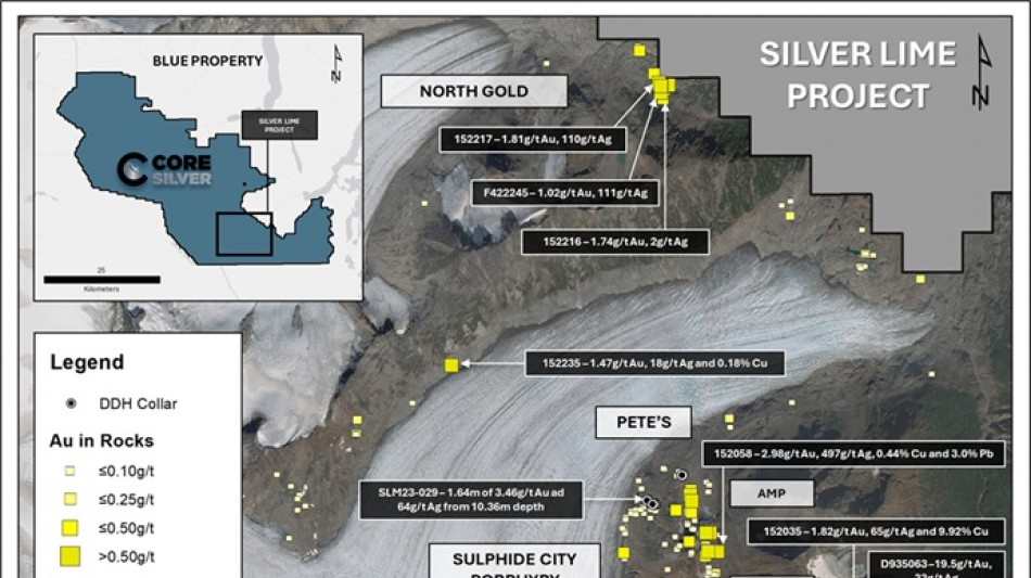 VANCOUVER, BC / ACCESS Newswire / November 3, 2025 / Core Silver Corp. ("Core Silver" or the "Company") (CSE:CC)(FSE:8ZR)(OTCQB:CCOOF) is pleased to summarize widespread gold results and their associated silver values from the Silver Lime Polymetallic Project ("Silver Lime" or the "Project"), located within the Company's 100%-owned Blue Property (the "Property") in the Atlin Mining District of northwestern British Columbia.