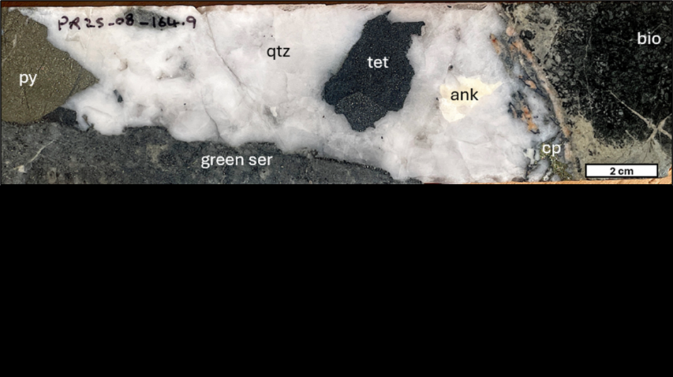 PR25-08 at 165 m - Andesite with green sericite alteration cut by high-sulfidation type quartz-ankerite veins with coarse tetrahedrite, pyrite, and chalcopyrite. This sample represents Epithermal Au-Ag mineralization, starting at shallow depths, and grades 0.29 g/t Au and 229 g/t Ag (from a 3 m sample interval).