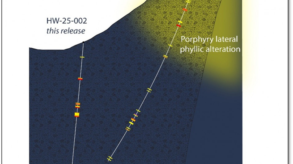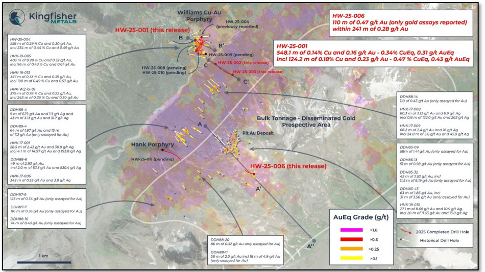 HW-25-001 was completed upslope and west of the mineralized porphyry at Williams that crops out at surface. It was drilled steeply to the east at 119o azimuth and -80o dip. The drill hole was designed to test the potassic core of the Williams porphyry system at depth, unfortunately it deviated more that 40 degrees on azimuth which was significantly more than expected and resulted in testing the flank of the system instead of the intended target. Despite this, HW-25-001 intersected potassic alteration overprinted by phyllic alteration and returned 548.1 m of 0.31 g/t AuEq or 0.34% CuEq including 124.2 m of 0.43 g/t AuEq or 0.47 % CuEq (Figures 4 & 5). This was the first drill test into Williams by Kingfisher, and it identified two distinct porphyry intrusive phases at Williams, enhancing Kingfisher's understanding of the mineralized system and enabled more precise targeting of the younger, more productive intrusive phase.