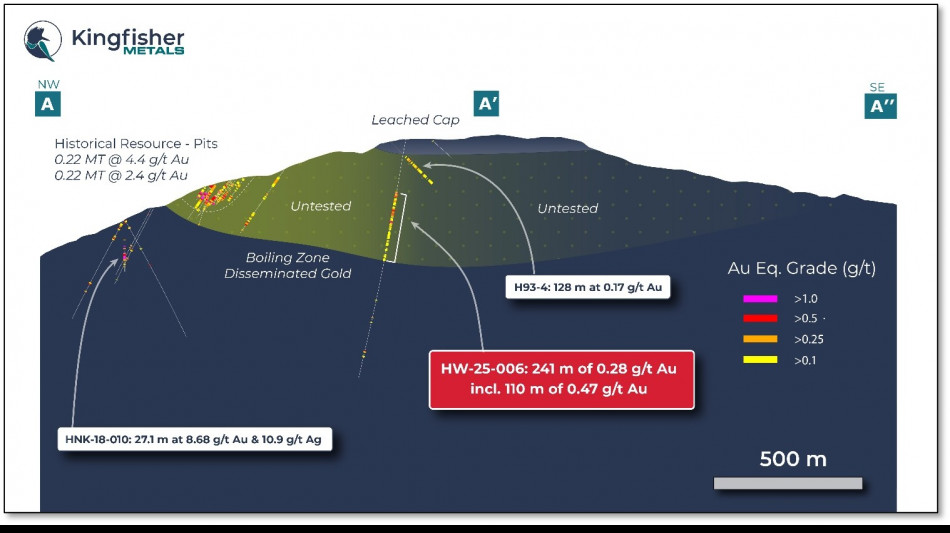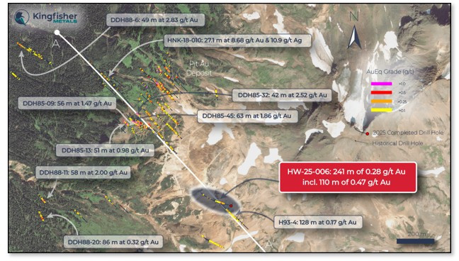 Hole HW-25-006 was collared approximately 500 m to the southeast of the historical non-43-101 compliant mineral resource within the Pit area (0.22 MT at 4.4 g/t Au at West Pit and 0.22 MT @ 2.4 g/t Au at East Pit). This drill hole returned 110.0 m of 0.47 g/t Au5 within a broader zone of 241.0 m of 0.28 g/t Au (Figures 2 & 3). These findings indicate potential for expanding a near-surface bulk tonnage gold system both laterally and vertically. The results of HW-25-006, combined with significant spacing between historical drill holes open a large search space for the Kingfisher Exploration Team to target in future exploration programs. Historical drilling within this near surface gold zone was primarly designed to test gold soil anomalies with minimal focus on testing higher-grade structural corridors within the prospective area. Integrating the recently completed LiDAR survey into our 3D geology model will strengthen targeting of higher-grade ore shoots and feeders to the lower grade disseminated gold system.