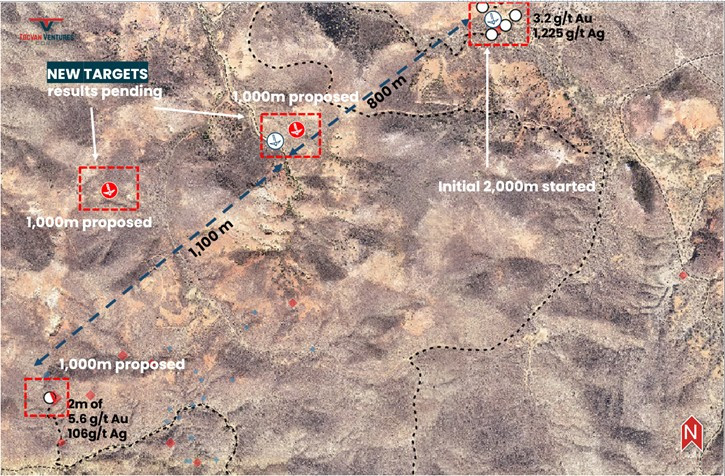New Discoveries: Three additional mineralized targets identified with historic underground workings, featuring vein breccia, alteration, and quartz veining.