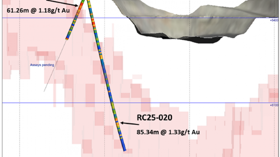The standout drilling intercepts include 85.34 metres at 1.33 g/t Aufrom RC25-020, a reverse-circulation hole drilled beneath the current pit floor, and 61.26 metres at 1.18 g/t Aufrom CM25-19 (a diamond core hole for which assays are still pending beyond this interval). Hole RC25-020's long intercept of consistent gold grades indicates a continuation of the gold mineralisation below the mined pit, extending the known mineralised envelope at depth. Hole CM25-19, an infill hole targeting a previously sparsely drilled zone, has already delivered a substantial gold interval in its upper section.