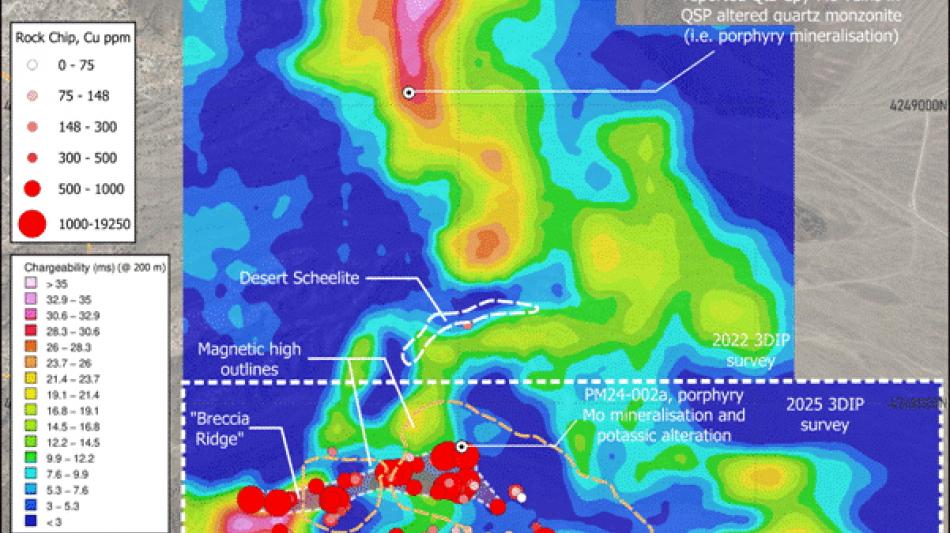 The Company interprets the resistive zone to represent silicic alteration of the metasediments since it coincides with outcropping areas of intense quartz stockwork veining. The extensive chargeable halo is interpreted to represent a "pyrite shell" to the porphyry system. Pyrite shells typically represent the outer extents of hypogene mineralisation in porphyry deposits. The inner part of the chargeable halo coincides with copper and molybdenum rich zones from previously reported rock chip sampling surveys.4