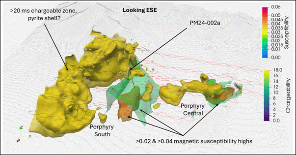 Figure 2.IP inversion model view looking downwards east-southeast at Porphyry South and Porphyry Central, showing PM24-002a drill collar and trace, dipoles from 3DIP surveys, >20 ms chargeable zones and >0.02 and >0.04 magnetic susceptibility highs (scale: black drill hole trace is ~400m).