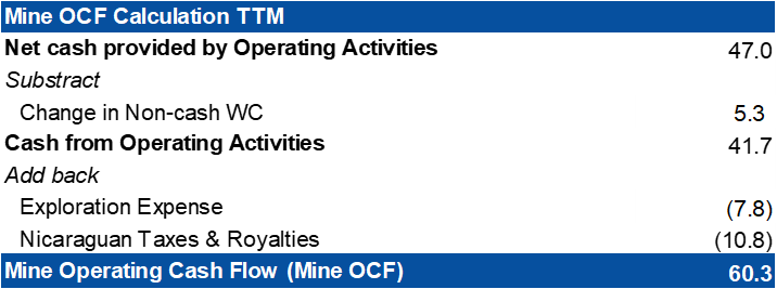 "Mine OCF" represents operating cash flow, excluding Nicaraguan taxes and royalties, changes in non-cash working capital and exploration expense