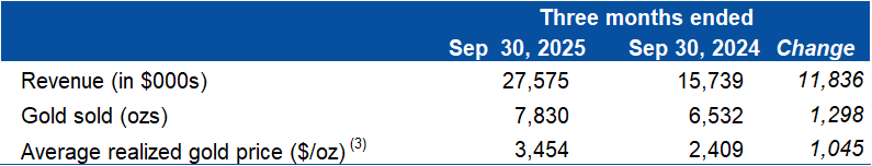 The Company's financial results for Q3 2025 reflect revenues of $27.6 million (vs. $15.7 million in Q3 2024) from the San Albino and Moss mines, which generated $8.9 million in Mine Operating Cash Flow (1) (4), $9.3 million in Adjusted EBITDA(1), and $1.2 million in Net Income. The Company sold 7,830 oz of gold at an average price of $3,454/oz (3) with Cash Cost of $2,115/oz, and All-In Sustaining Cost ("AISC") of $2,561/oz (1) (2), which includes the initial ramp up of the Moss Mine.