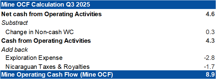 Q3 2025 - Mine OCF Calculation and Cash Reconciliation (in $ million)
