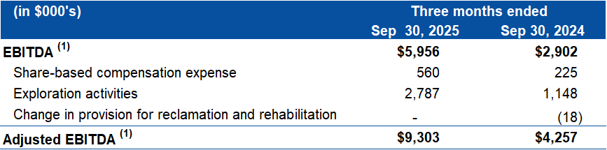 "Adjusted EBITDA" represents EBITDA, adjusted to exclude exploration activities, share-based compensation and change in provision for reclamation and rehabilitation.