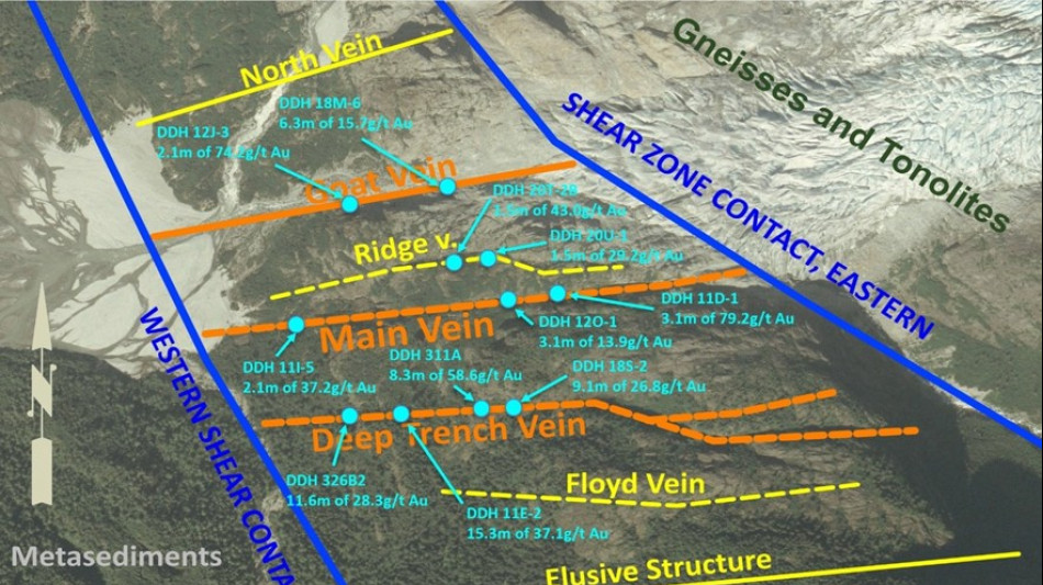 Deep Trench Vein: 15.3m grading 37.1 g/t Au, 8.3m grading 58.6 g/t Au, 11.6m grading 28.3 g/t Au