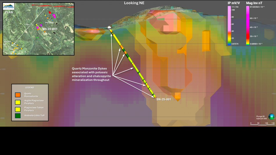 As the inaugural subsurface test of Star North, SN‑25‑001 provides the first drill‑hole look beneath compelling coincident geochemical and geophysical anomalies and will be integral to refining the 3‑D mineralization model for follow‑up drilling in 2026. In combination with the Phase 1 and Phase 2 results from Star Main, and ongoing work at the Copper Creek satellite target, the textures, alteration and chalcopyrite occurrences observed in SN‑25‑001 are encouraging indicators that Star North may represent a second mineralized center within a broader porphyry cluster framework on the Star Project.