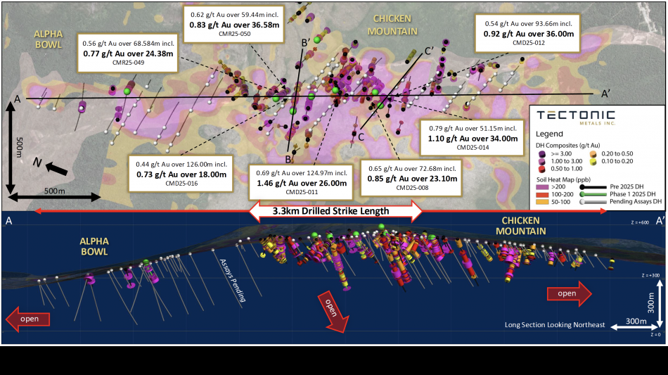 Figure 1: Plan View and Long Section looking Northeast, au composites with pending assays can be viewed at: https://www.tectonicmetals.com/_resources/news/nr-20251126-Figure1.png