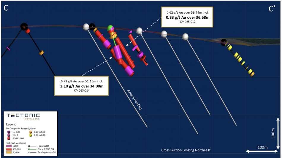 Figure 3: Cross Section C-C' showing 2025 Phase 1 metallurgical drill holes CMD25-012 and CMD25-014 and CMR-050. Phase 2 resource delineation drill holes (assays pending) depicted in white collars can be viewed at: https://www.tectonicmetals.com/_resources/news/nr-20251126-Figure3.png