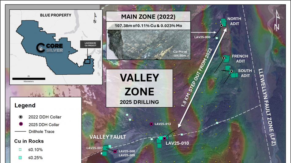 VANCOUVER, BC / ACCESS Newswire / November 28, 2025 / Core Silver Corp. ("Core Silver" or the "Company") (CSE:CC)(FSE:8ZR)(OTCQB:CCOOF) is pleased to provide visuals showcasing representative porphyry copper-molybdenum-silver (Cu-Mo-Ag) mineralization intersected in drill hole LAV25-010, the first of four deep exploratory diamond drill holes completed during the 2025 season at the Laverdiere Copper Project (the "Project" or "Laverdiere"), located on the eastern Blue Property (the "Property") in the Atlin Mining District, northwestern British Columbia.