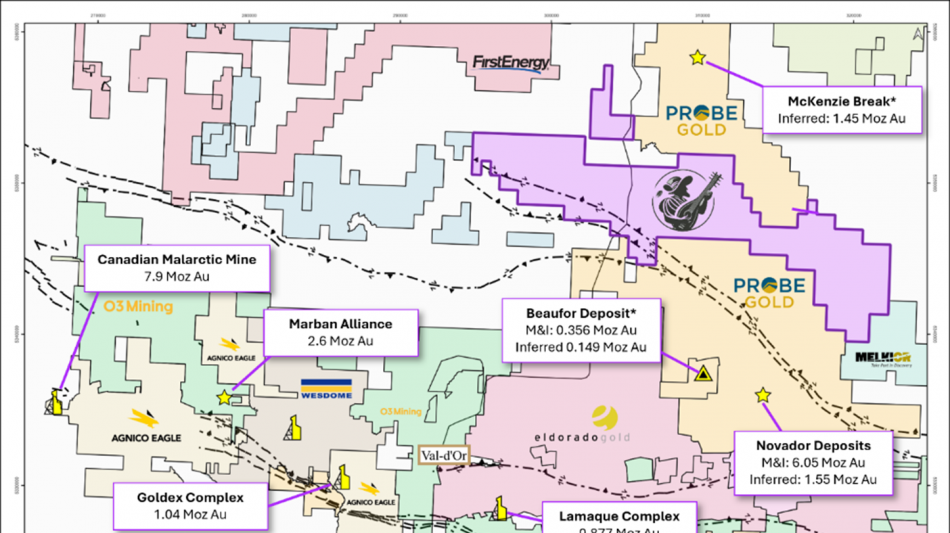 Comprising 212 mineral claims totalling about 119.5 km2, Senneville property is located within the prolific Val d'Or Mining Camp between Probe Gold's McKenzie Break deposit (1,452,261 ounces Inferred1) to the north and the Probe's Novador Development Project to the south (6,405,000 ounces M&I and 1,550,200 ounces Inferred2).