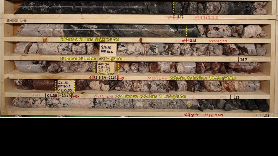 Drill hole 25MJ005 tested the conductive zone previously identified by fixed loop electro-magnetic (FLEM) geophysical survey (reported February 20, 2025). An earlier hole from this program, 25MJ001, was collared 45 metres to the northeast and intersected stacked intervals of high-grade gold mineralization coinciding with the conductor, as reported on October 27, 2025.