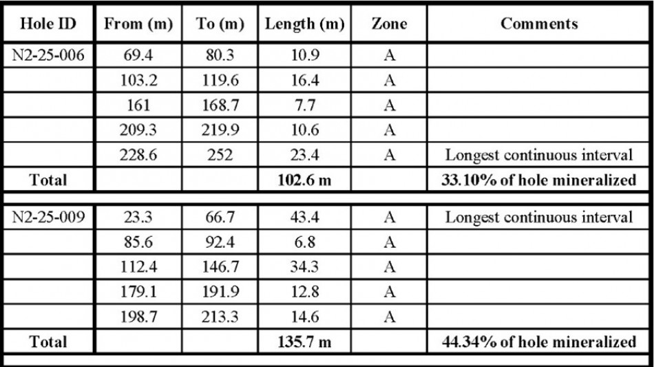 N2-25-009: 135.7 metres of target mineralization intercepted beginning at 23.3 metres downhole, with multiple intervals over 30 metres in width including up to 43.4 metres.