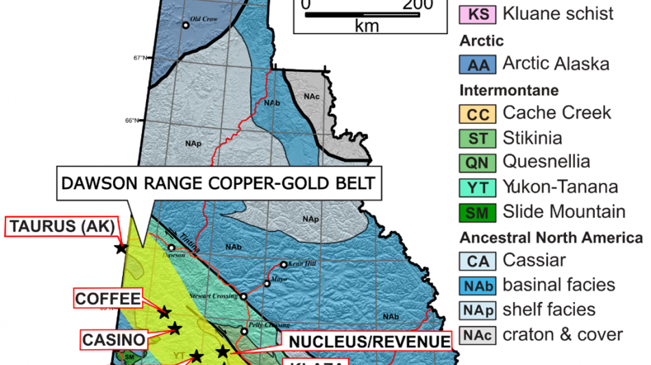 The Hopper Project hosts copper-gold skarn and porphyry mineralization. It lies within the southern part of the Dawson Range Copper-Gold Belt, a metallogenic province in west-central Yukon that hosts several major deposits, including Western Copper and Gold Corporation's Casino porphyry copper-gold deposit, located 190 km to the north-northwest (Figure 1). The property covers a 74 km2 area and is accessible via a network of roads and trails. Mineral occurrences on the property, which collectively make up the Copper Castle skarn target and the Hopkins North porphyry target, are associated with a 4 by 6 km intrusion referred to as the Hopper Pluton. Dating of the pluton has yielded a late Cretaceous age that is consistent with most mineralization along the belt, including the Casino deposit.