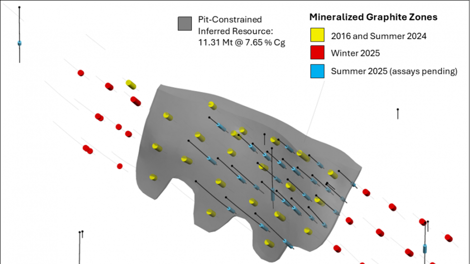 The winter 2025 program (see Company's press release dated November 12, 2025 for results) focused on expansion of the MRE toward the northwest and southeast, extending the strike-length of graphite mineralization at inferred-spaced drilling by 700 m. The summer 2025 program focused on in-fill drilling of the MRE and comprised 6,691 m over 35 holes (Figure 2 and 3), inclusive of the 1,103 m from the 10 geotechnical drillholes completed at the beginning of the summer (refer to the Company's release on September 8, 2025). Locations and orientations of drillholes of the in-fill program are listed in Table 1.