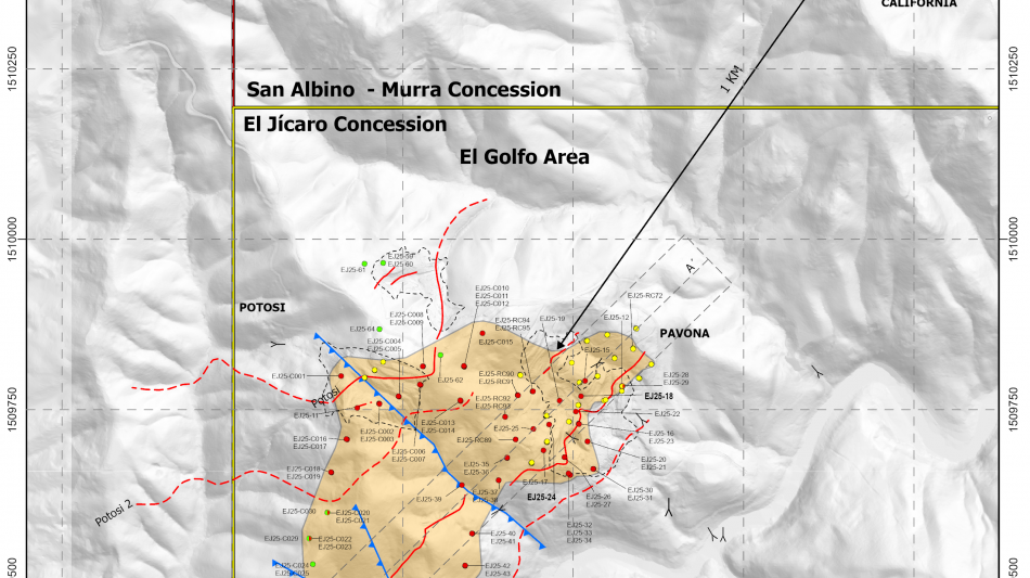 Pavona | EJ25-15 | 37.00 | 37.50 | 0.50 | 1.85 | 5.3 | 1.85 g/t Au and 5.3 g/t Ag over 0.50 m |