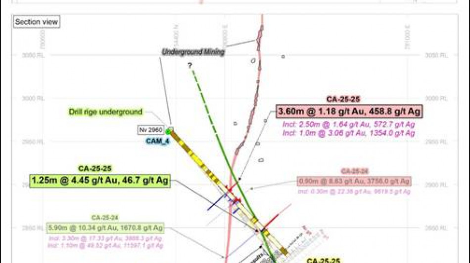 The Drill hole CA-25-28 intersected the mineralized zone grading 6.40 g/t Au and 384.1 g/t Ag over 3.15 meters and it includes a grade of 9.66 g/t Au and 1432.0 g/t Ag over 0.70 meters, occurs within the tension vein (mixed mineralized zone).