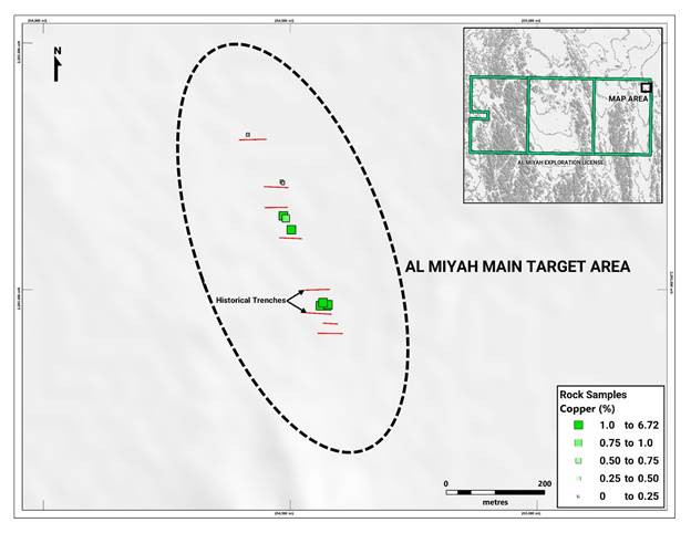 Samples from Al Miyah Main returned assays up to 4.53 g/t Au, 3.72% Cu, and 42.2 g/t Ag.