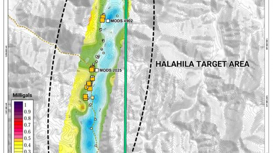 Figure 7. Halahila target with contoured gravity and geochemistry results for gold