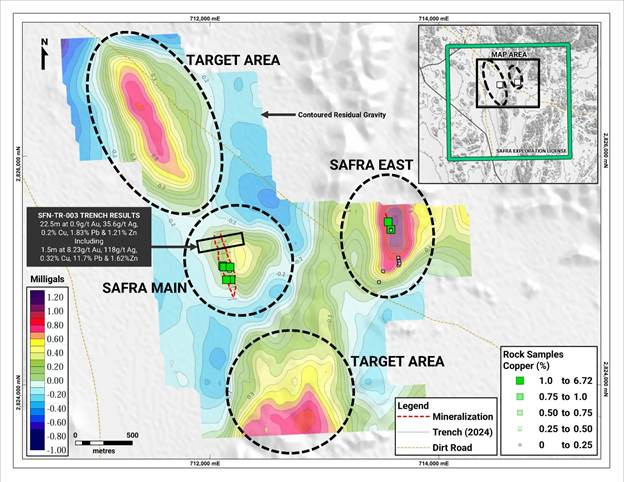 Figure 2. Target areas at Safra with contoured gravity and geochemistry results for copper