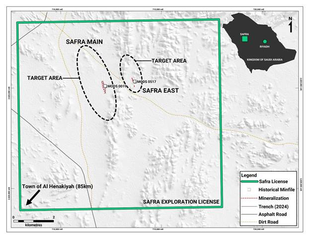 The Safra Project is located within the Nuqrah VMS Belt at the western margin of the Afif Terrane, a region hosting numerous ancient workings and active gold mines. Two documented VMS occurrences, Safra Main and Safra East, are situated approximately 1.5 km apart (Figure 1). Modern exploration completed by SDC, including gravity surveys, trenching, and surface sampling, has outlined multiple sub-parallel VMS zones with strong geophysical and geochemical signatures (Figure 2).