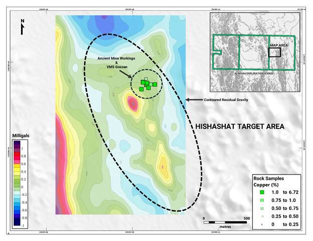 Coincident gravity highs were identified adjacent to VMS gossans and ancient workings at Hishashat.