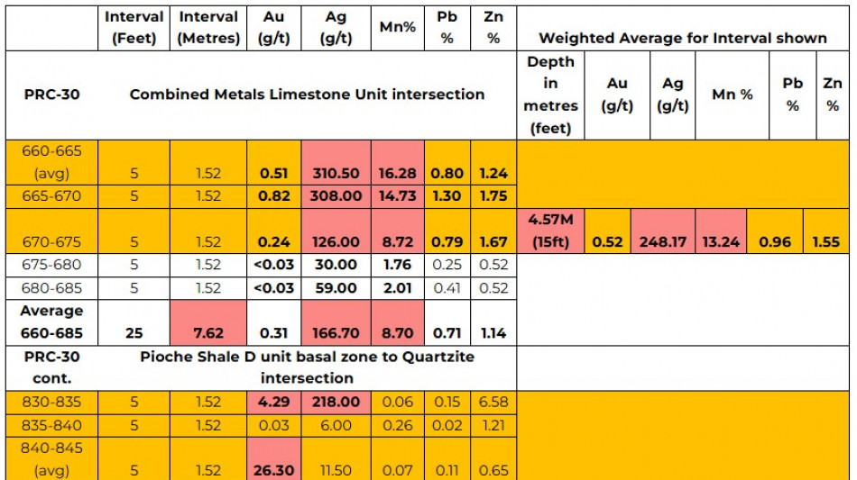 30 feet (9.15 metres) at 139.92 g/t Ag, 0.68 g/t Au,8.57% Mn, 1.48% Pb, and 1.06% Zn; and