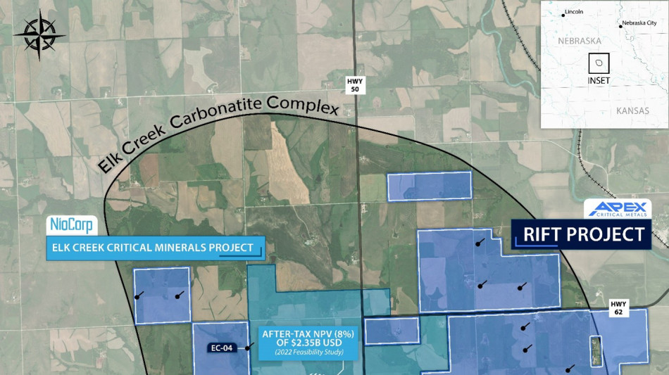 Apex Critical Metals Corp. is a Canadian exploration company focused on advancing rare earth element (REE) and niobium projects that support the growing demand for critical and strategic metals across the United States and Canada. The Company's flagship Rift Project, located within the highly prospective Elk Creek Carbonatite Complex in Nebraska, U.S.A., hosts extensive rare earth rights surrounding one of North America's most advanced niobium-REE deposits. Historical drilling across the complex has reported broad intervals of high-grade REE mineralization, including intercepts such as 155.5 m of 2.70% REO and 68.2 m of 3.32% REO.