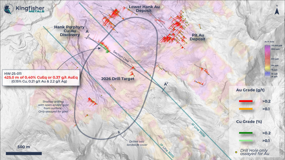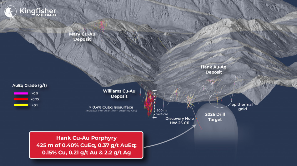 Dustin Perry, CEO of Kingfisher, states, "The final hole of the 2025 program validates our long-standing belief that the shallow Hank Au-Ag epithermal mineralization is driven by a large porphyry Cu-Au system. This impressive first intercept of 425.0 metres of 0.40% CuEq is interpreted to be on the margin of the system, with anticipated increases in grade toward the conceptual core. The scale and consistency of this discovery, along with a wide untested area hosting strong geophysical anomalies, highlight the potential for further exploration and support the need for aggressive follow-up drilling in 2026."