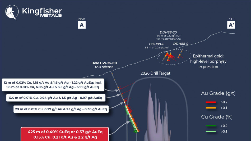 Drillhole HW-25-011 confirms discovery of a new copper - gold (Cu-Au) porphyry system below the Hank epithermal gold-silver (Au-Ag) mineralized system. Assays from HW-25-011 returned 425.0 meters1 (m) of 0.40% CuEq2 (0.15% Cu, 0.21 g/t Au and 2.2 g/t Ag) (Figure 1 - 5) This newly identified zone represents a blind discovery, as porphyry Cu-Au mineralization had not previously been recognized or reported at Hank. These results validate Kingfisher's exploration model and demonstrate the potential for the Hank area to host one or more large-scale porphyry Cu-Au systems.