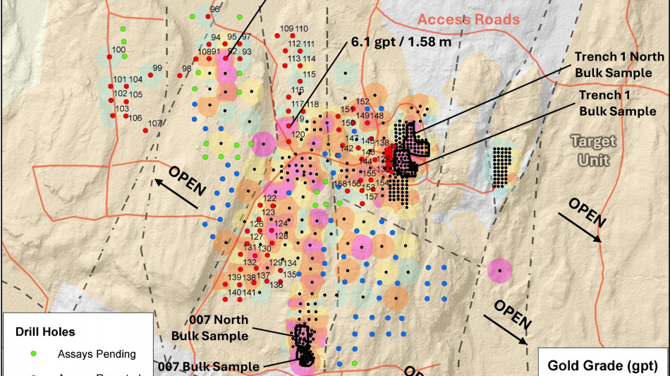 In addition, 13 grade-control drill holes were completed on the West side of the Trench 1 bulk sample site to define an additional bulk sample area (Figure 1). These holes returned strong near-surface intercepts within 10 metres of surface, including 5.6 g/t gold over 1.47 metres, 4.7 g/t gold over 1.60 metres, and 4.3 g/t gold over 1.72 metres. Additional details of this bulk sample site and its extraction will be provided when available.